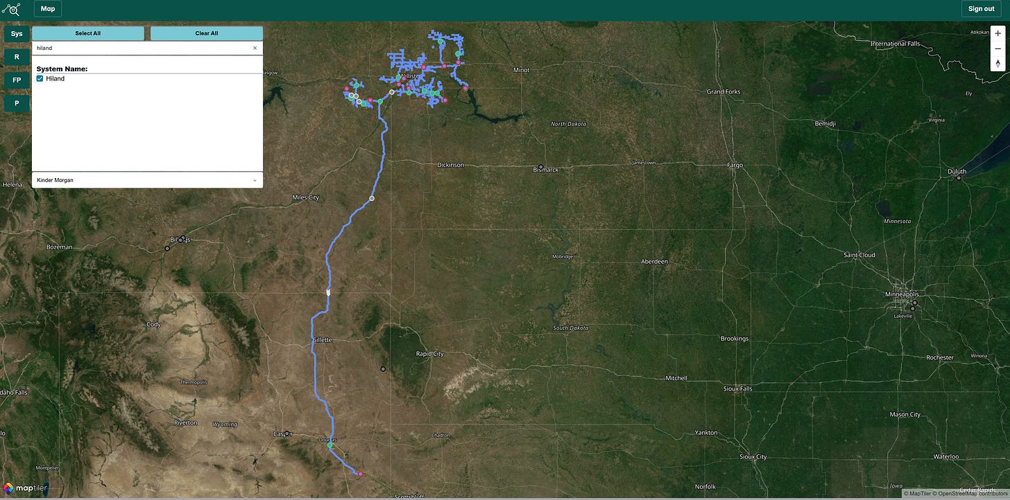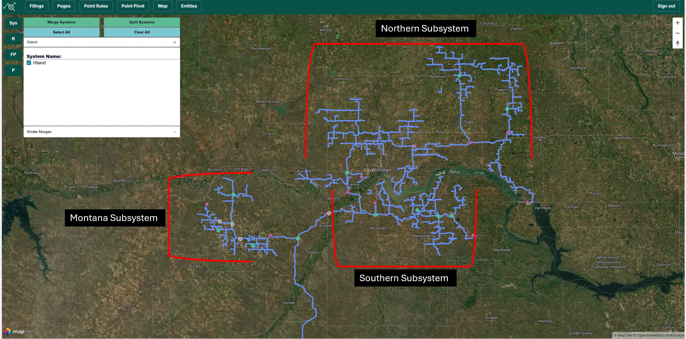 The Hiland system, owned by Kinder Morgan, encompasses gathering pipelines in the Bakken region that collect approximately 165,000 barrels per day (bpd) of crude oil. Of this volume, only about 65,000 bpd flows southward via the Double H pipeline from the Montana-North Dakota border to Guernsey, Wyoming. The majority of the gathered oil (around 100,000 bpd) feeds into third-party egress pipelines or rail terminals, including Enbridge, Dakota Access Pipeline (DAPL), and Bridger, highlighting the system’s role as a key aggregator rather than a primary transporter to Guernsey.