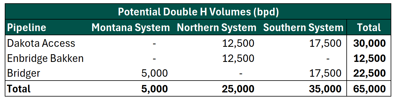 Geographically, three main egress options stand out for absorbing the displaced volumes: DAPL, Enbridge’s Bakken line, and Bridger. DAPL offers strong connectivity across both northern and southern subsystems in North Dakota, positioning it to capture barrels from areas previously routed to Double H. Enbridge’s Bakken line, with available capacity after historical competition from DAPL reduced its flows, aligns well with the northern subsystem but has limited reach into southern gathering areas. Bridger excels in the Montana (Richland County) and southern North Dakota subsystems through multiple trunk line connections, though it lacks northern access above the river.