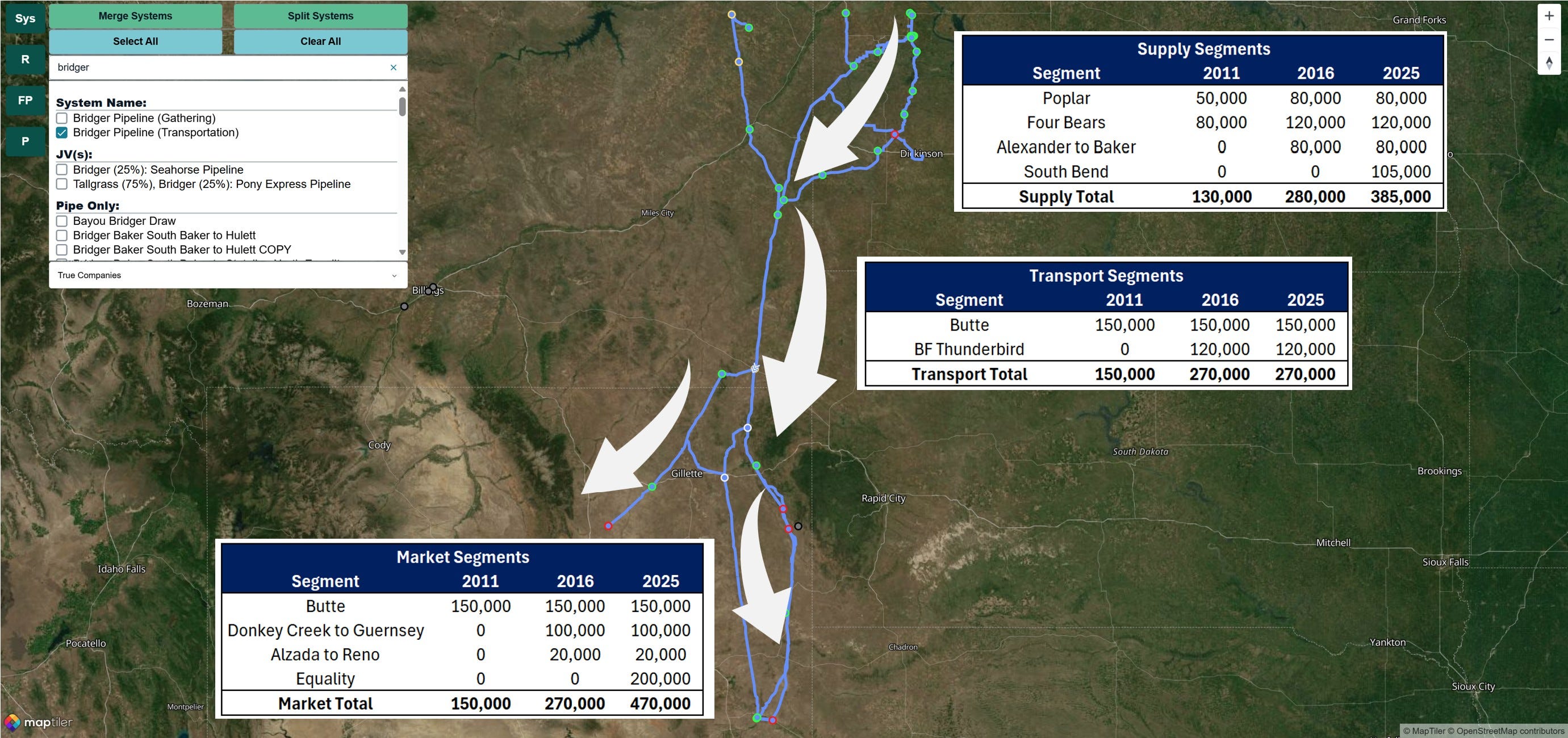 The Bridger system’s history offers a glimpse into its adaptation to the Bakken’s oil boom. In 2011, before the region’s production surged, Bridger’s supply segments included southbound capacity on the Poplar system (50,000 barrels per day) and the Four Bears system (80,000 barrels per day), feeding into the Baker terminal in Montana. At that time, oil also flowed northward on a separate segment to the Alexander terminal, connecting to Enbridge’s network for Midwest refineries.