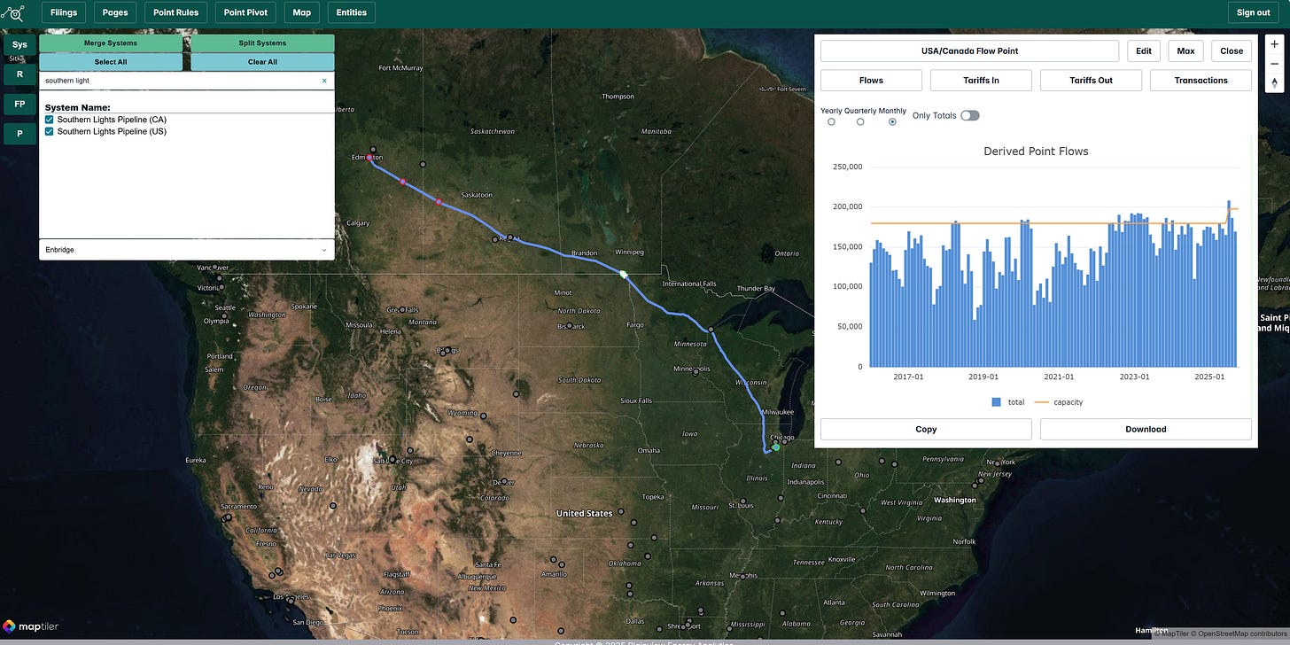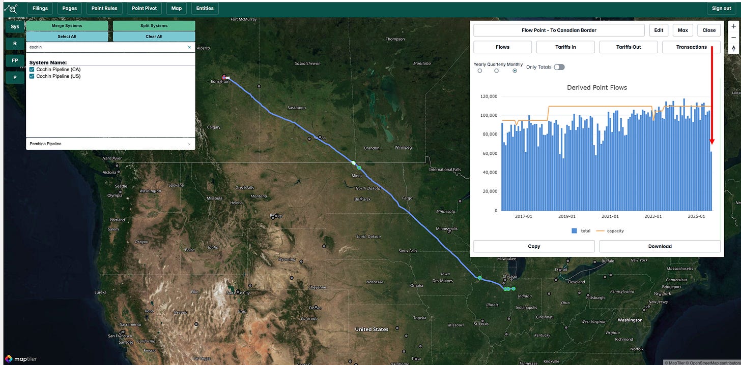 Cochin flows dropped significantly from August to September. The decline aligns with Pembina Q3 earnings commentary of narrower Canada–U.S. condensate price differentials and lower spot volumes. One weak month could be an anomaly but worth monitoring to see if barrels may be shifting between Cochin and the expanded Southern Lights system.
