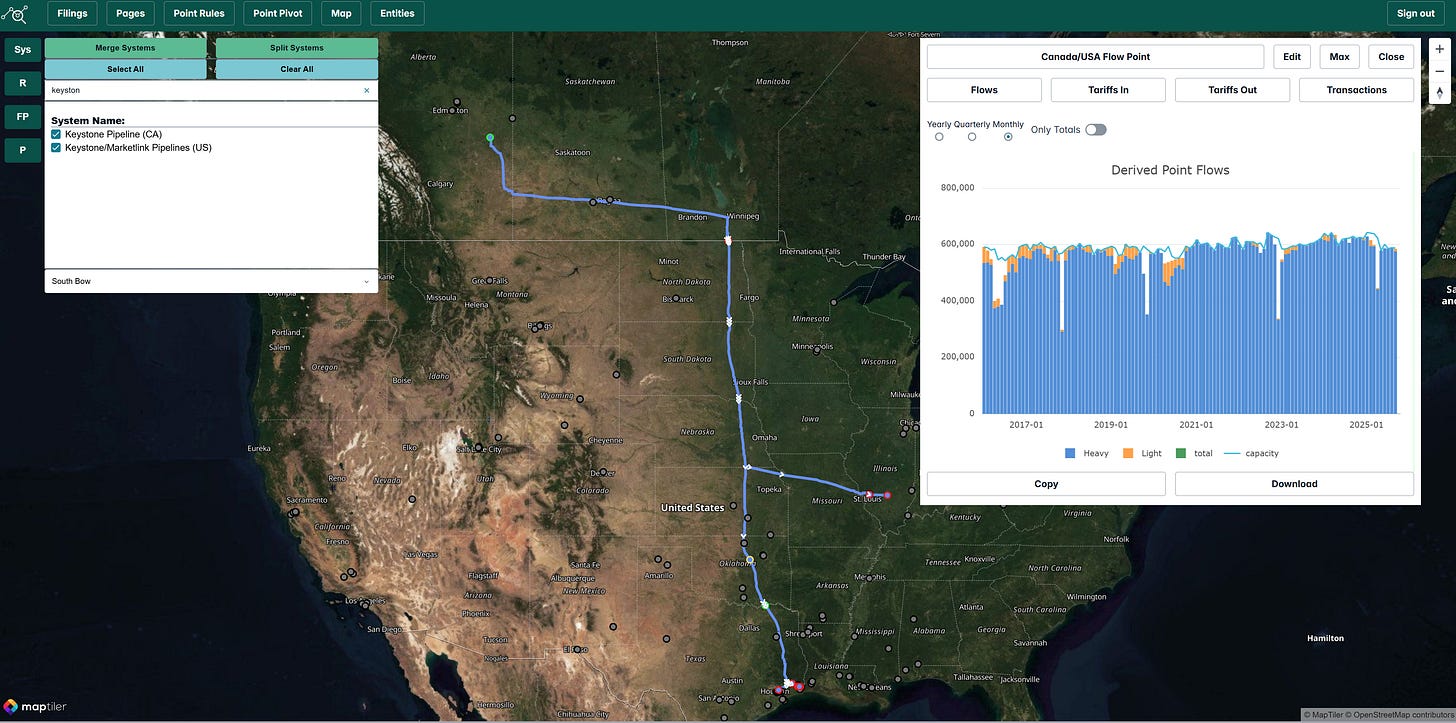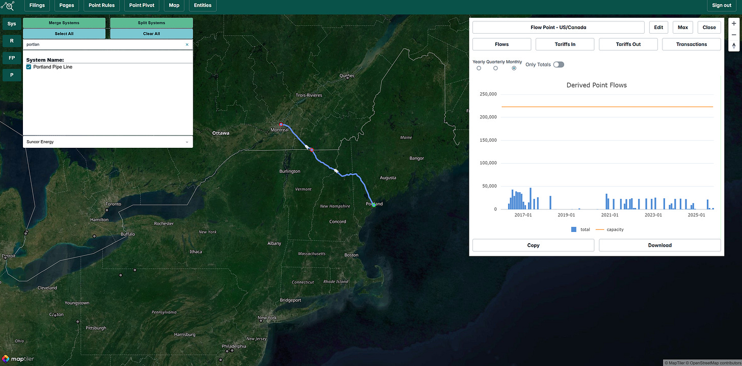 Montreal and Portland–Montreal lines (Suncor-operated): Very low utilization; Eastern Canadian refineries continue to favor cheaper Western Canadian barrels via Enbridge Line 9.