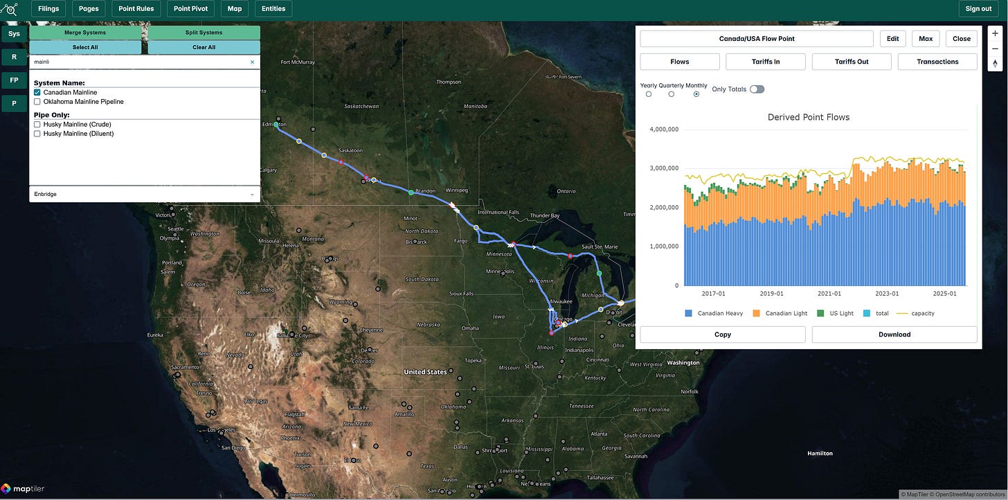 The Enbridge Mainline into the U.S. continues to operate essentially full. Minor Q3 capacity reductions reflect temporary operating variances and refinery turnaround schedules rather than lack of supply. Volumes stayed tightly aligned with available capacity, confirming the system is still constrained despite the new TMX capacity coming online 18 months ago.