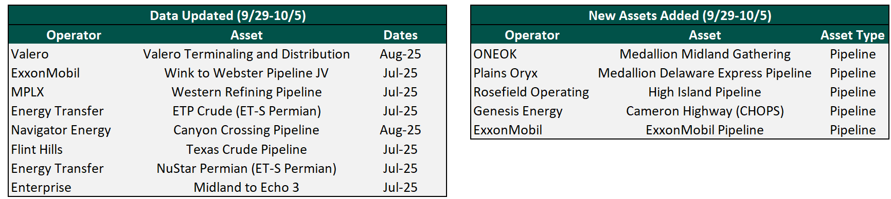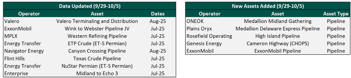 Plainview has over 200 assets with crude oil flow or transactional data on our platform and continues to add more each week. Data for existing assets under coverage are posted as soon as they become available. Below are the assets that were updated this week or newly added to coverage.