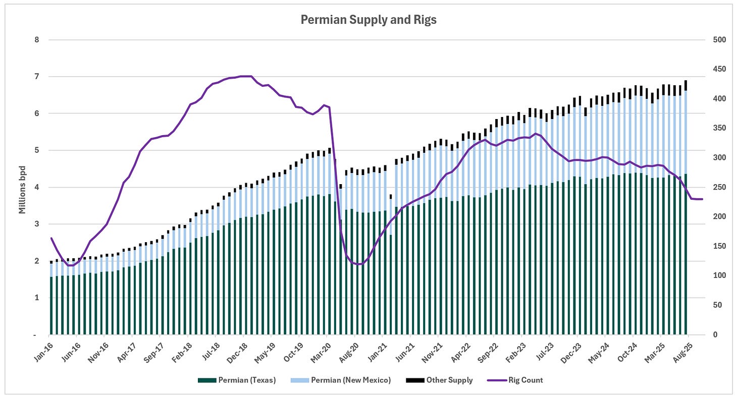 EIA production data released last week revealed a notable month-over-month increase in oil production in Texas and New Mexico. Plainview’s basin supply model, incorporating EIA state-reported data alongside Texas Railroad Commission and New Mexico state data, estimates Permian production rose by over 130,000 barrels per day, setting a new all-time record. These production gains persist despite a notable decline in rig counts over recent months, with Permian rig counts down more than 20% year over year. The continued increase in production amid reduced drilling activity is intriguing but not unprecedented, given the typical six-to-nine-month lag between rig reductions and their impact on output. Consequently, production is likely to plateau in the latter half of 2025 and into 2026, reflecting observed declines in Permian activity levels.