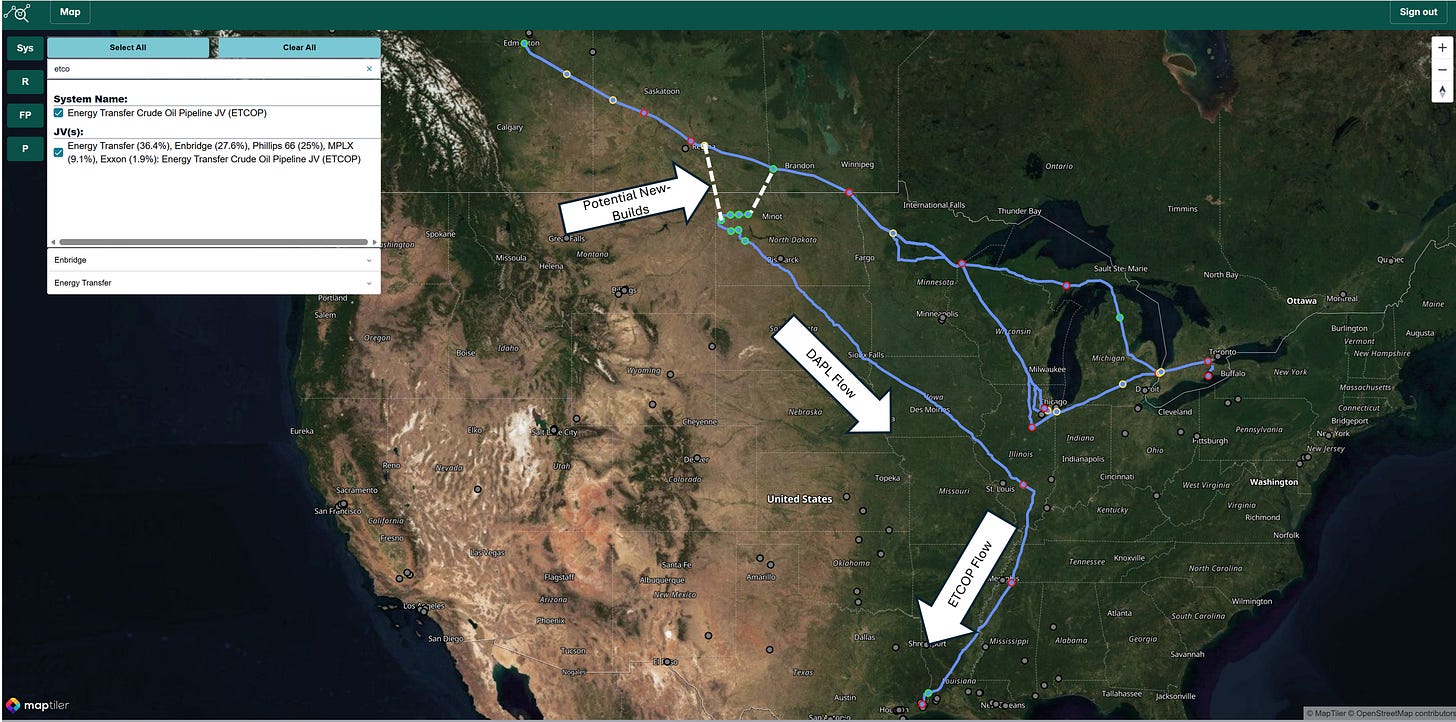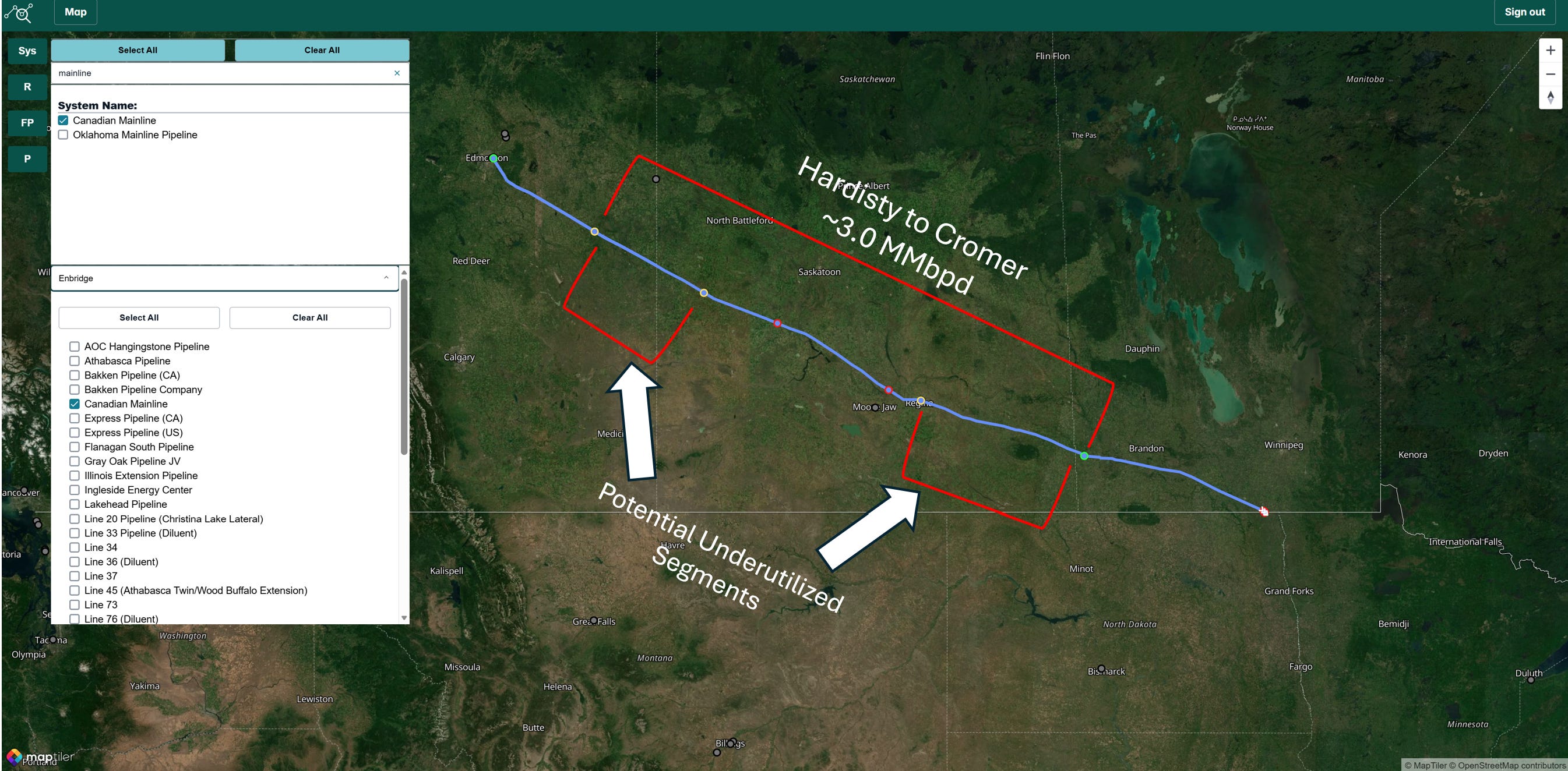 Although specifics remain limited, a likely configuration involves connecting DAPL to Enbridge’s Mainline. While the Mainline generally operates near full capacity, certain segments likely hold pockets of open space, such as from Hardisty to Kerrobert and Regina to Cromer. These underutilized areas could enable optimizations like pump station upgrades or drag-reducing agents across the Mainline’s five parallel lines, minimizing the need for extensive new construction.