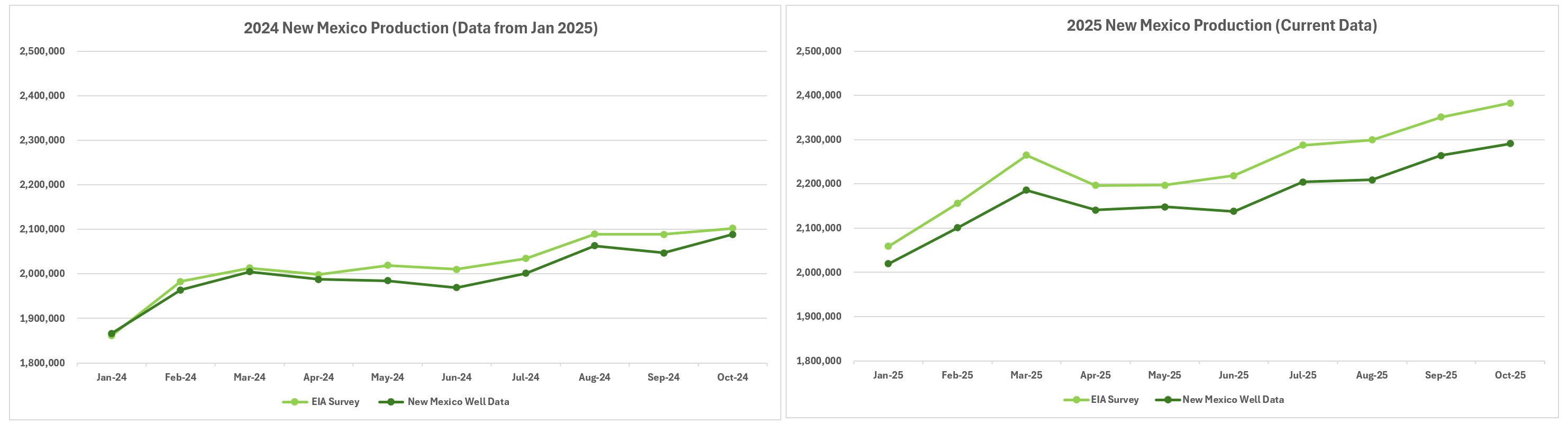 For example, in early 2025, the gap between 2024 New Mexico state-reported crude production and EIA estimates stood around 20,000 barrels per day (left graph below). These numbers converged in 2025 as state reported data slowly increased to closely match the EIA survey data. However, the discrepancy has widened significantly in 2025, with state data now underreporting EIA figures by about 70,000 barrels per day (right graph below), the largest margin in many years. This large gap raises questions about potential overstatement in EIA survey-based production or substantial understatement in state well data.