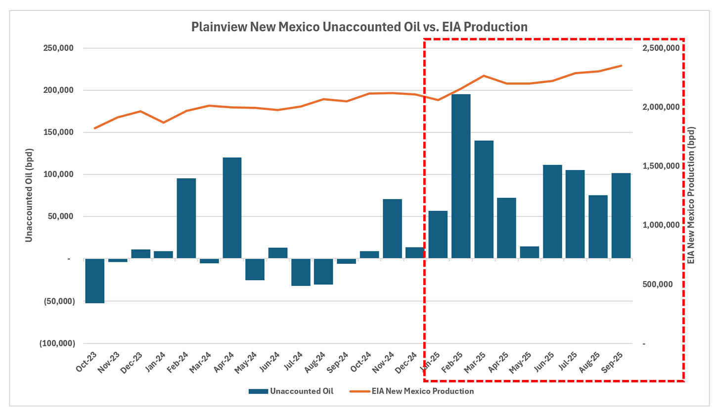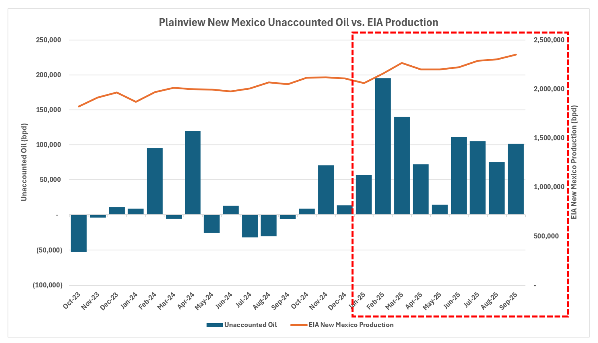 To assess the balance, Plainview incorporates EIA supply estimates alongside reported pipeline flows and refinery runs in New Mexico as a demand proxy. This methodology creates a supply and demand model intended to balance supply (primarily production) against demand (pipeline egress plus refinery runs). The resulting supply surplus in our New Mexico balance (blue bars in the graph below) has grown from 20,000 barrels per day in 2024 to 85,000 barrels per day in 2025, lending support to the notion that EIA’s reported New Mexico production may be overstated. As the end of 2025 production reporting approaches, ongoing monitoring of both state and EIA data will reveal which set undergoes significant revisions.