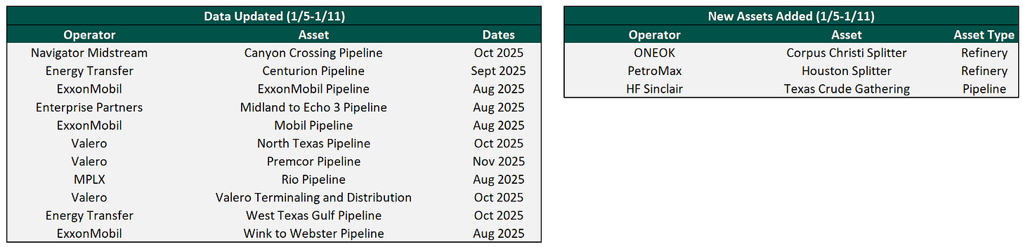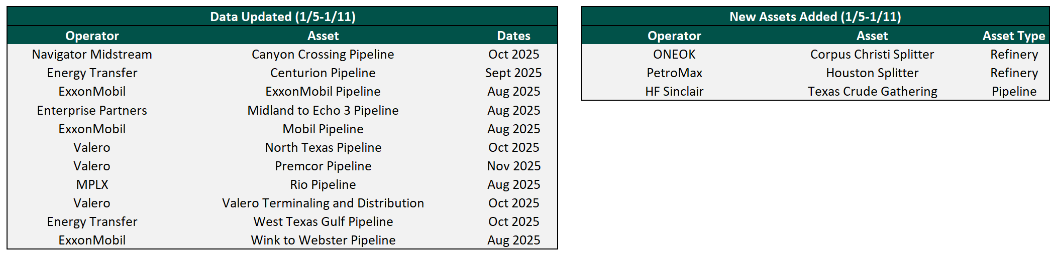 Plainview has over 300 assets with crude oil flow or transactional data on our platform and continues to add more each week. Data for existing assets under coverage are posted as soon as they become available. Below are the assets that were updated this week or newly added to coverage.