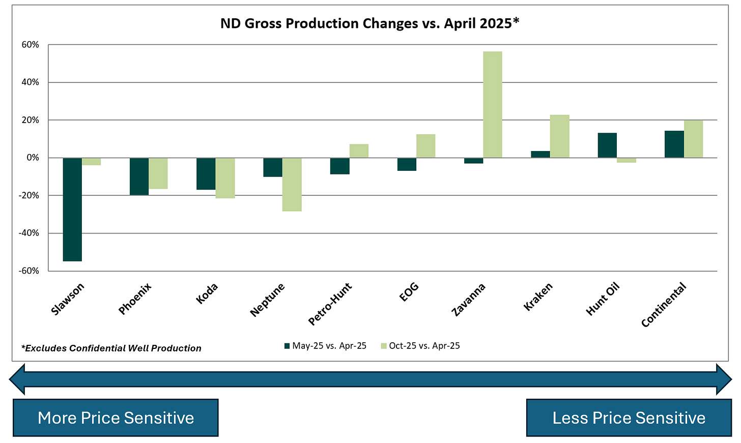 Despite the low-price environment, several producers demonstrated resilience and continued to grow output from April through October 2025. Companies including EOG Resources, Zavanna, Kraken, and Continental expanded production, likely supported by stronger well economics, financial hedges, or physical price protections that shielded them from downside risk. With WTI once again trading below $60 per barrel as of early 2026, ongoing monitoring of these operators’ monthly production reports will be key to assessing any renewed potential for shut-ins or further activity adjustments in the Bakken.