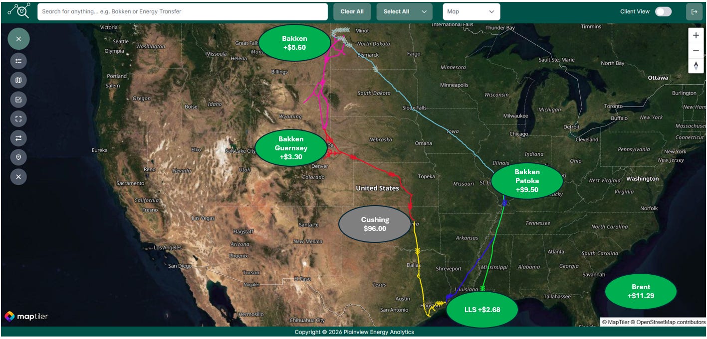 The massive premium at Patoka likely stems from Midwest (PADD 2) refineries aggressively bidding up these light sweet barrels to secure domestic supply and avoid losing them to export markets, where international benchmarks such as Brent are already trading more than $11 above Cushing. This localized scramble is likely to shift some crude away from lower priced markets (Guernsey, Cushing) and toward Patoka in the near term, delivering short-term upside potential for pipelines like Dakota Access that deliver into the Patoka area.