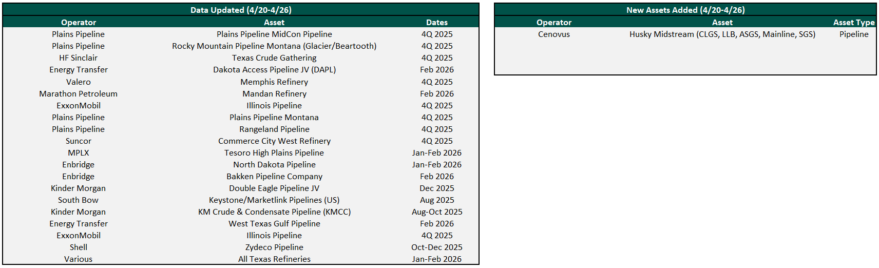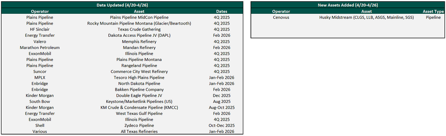 Plainview has over 300 assets with crude oil flow or transactional data on our platform and continues to add more each week. Data for existing assets under coverage are posted as soon as they become available. Below are the assets that were updated this week or newly added to coverage.