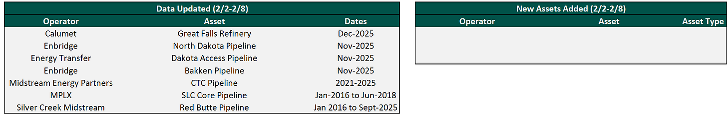 Plainview has over 300 assets with crude oil flow or transactional data on our platform and continues to add more each week. Data for existing assets under coverage are posted as soon as they become available. Below are the assets that were updated this week or newly added to coverage.
