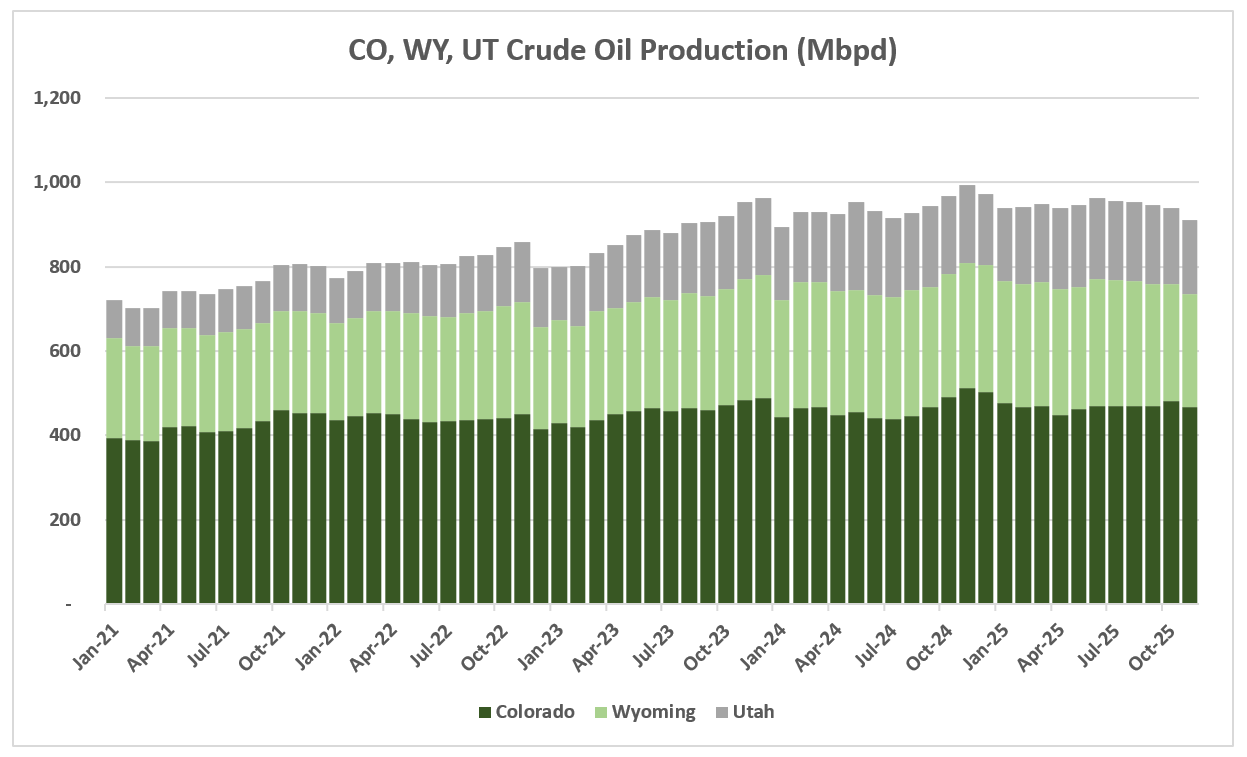 The U.S. Energy Information Administration (EIA) released November 2025 crude oil production data on Friday, highlighting continued crude oil production declines in several tier 2 basins, particularly across PADD 4 states. Colorado, Wyoming, and Utah recorded notable year-over-year drops compared with November 2024. Wyoming posted the steepest percentage decline at approximately 9%, with more recent data showing even greater weakness, down roughly 11% from its June 2025 peak. Colorado volumes fell around 9% year over year, while Utah, which had been a reliable source of post-COVID production growth, saw output decrease by about 5%.