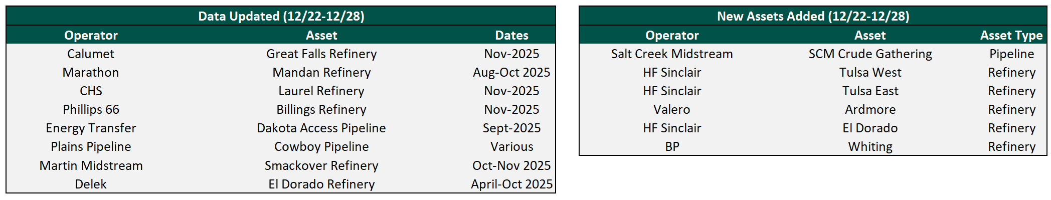 Plainview has over 300 assets with crude oil flow or transactional data on our platform and continues to add more each week. Data for existing assets under coverage are posted as soon as they become available. Below are the assets that were updated this week or newly added to coverage.