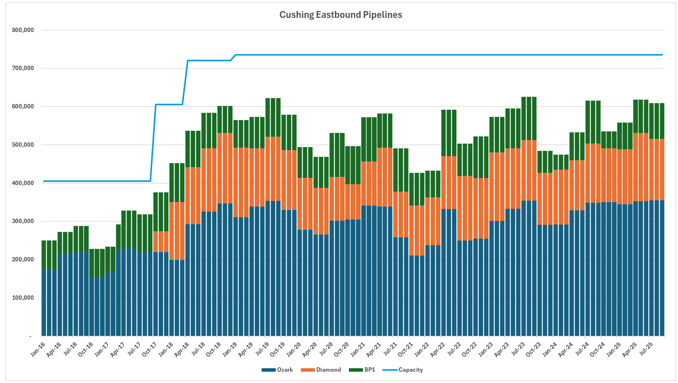 Although some eastbound capacity remains unused, particularly on the BP1 line, flows have stayed remarkably consistent since Diamond’s startup. This steady demand underscores Cushing’s enduring importance as a storage and logistics hub, enabling Midwest refineries to access light crude reliably and cost-effectively.
