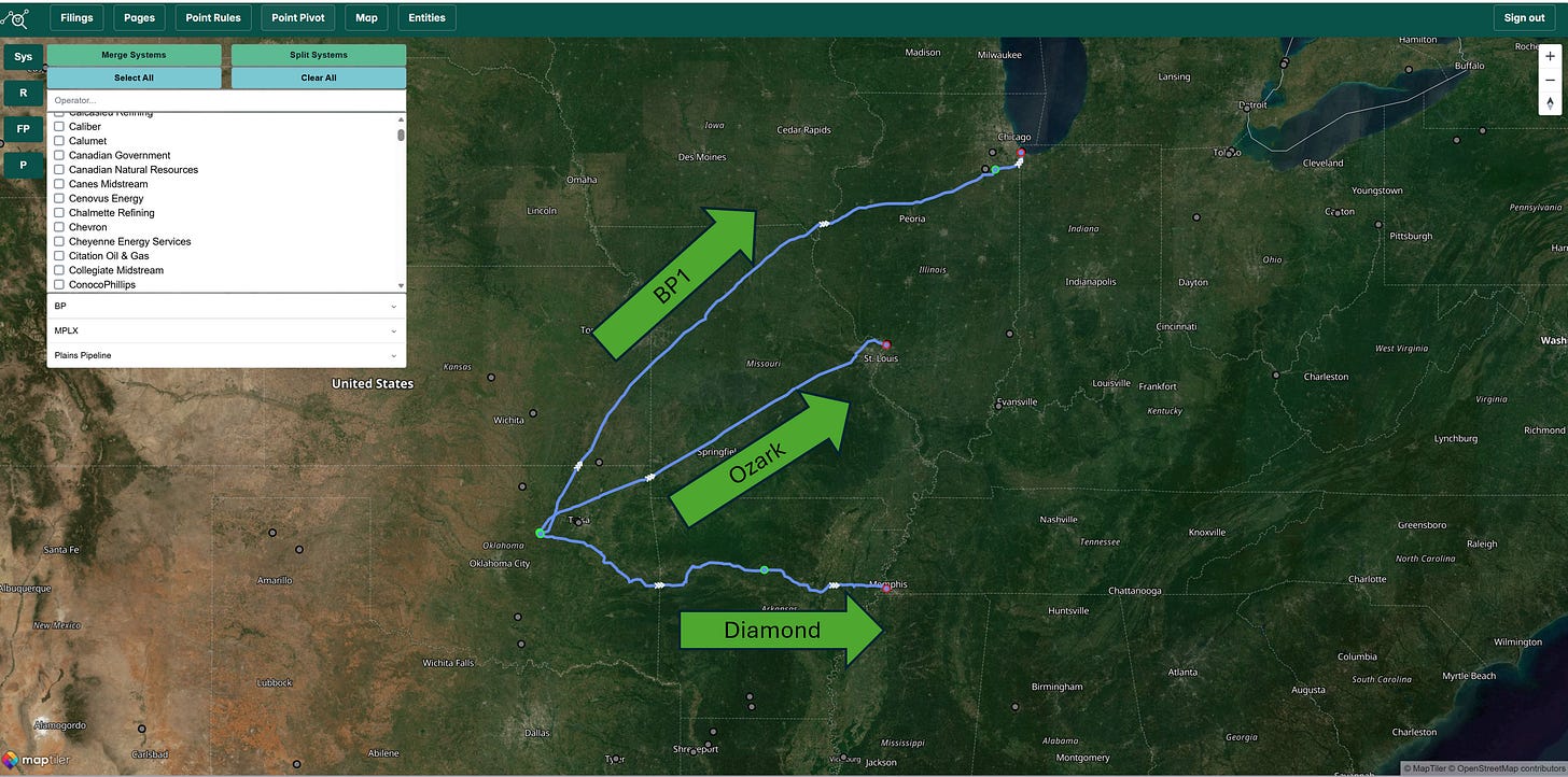 Three major eastbound pipelines provide approximately 700,000 barrels per day of capacity out of Oklahoma, with typical flows ranging from 500,000 to 600,000 barrels daily. The BP1 pipeline, owned by BP, transports lighter barrels primarily to the Whiting refinery in Indiana, which relies mainly on heavy Canadian crude but depends on this line for a significant portion of its light oil needs. Meanwhile, MPLX’s Ozark pipeline delivers crude to the Wood River, Illinois, area, where it supplies the Wood River refinery and connects to additional pipelines feeding multiple PADD 2 refineries, including those operated by Marathon. The third line, the Diamond Pipeline, a joint venture between Valero and Plains that began operations in 2017, moves light barrels directly to Valero’s Memphis refinery, displacing volumes previously supplied northbound via the Capline system from the Gulf Coast.
