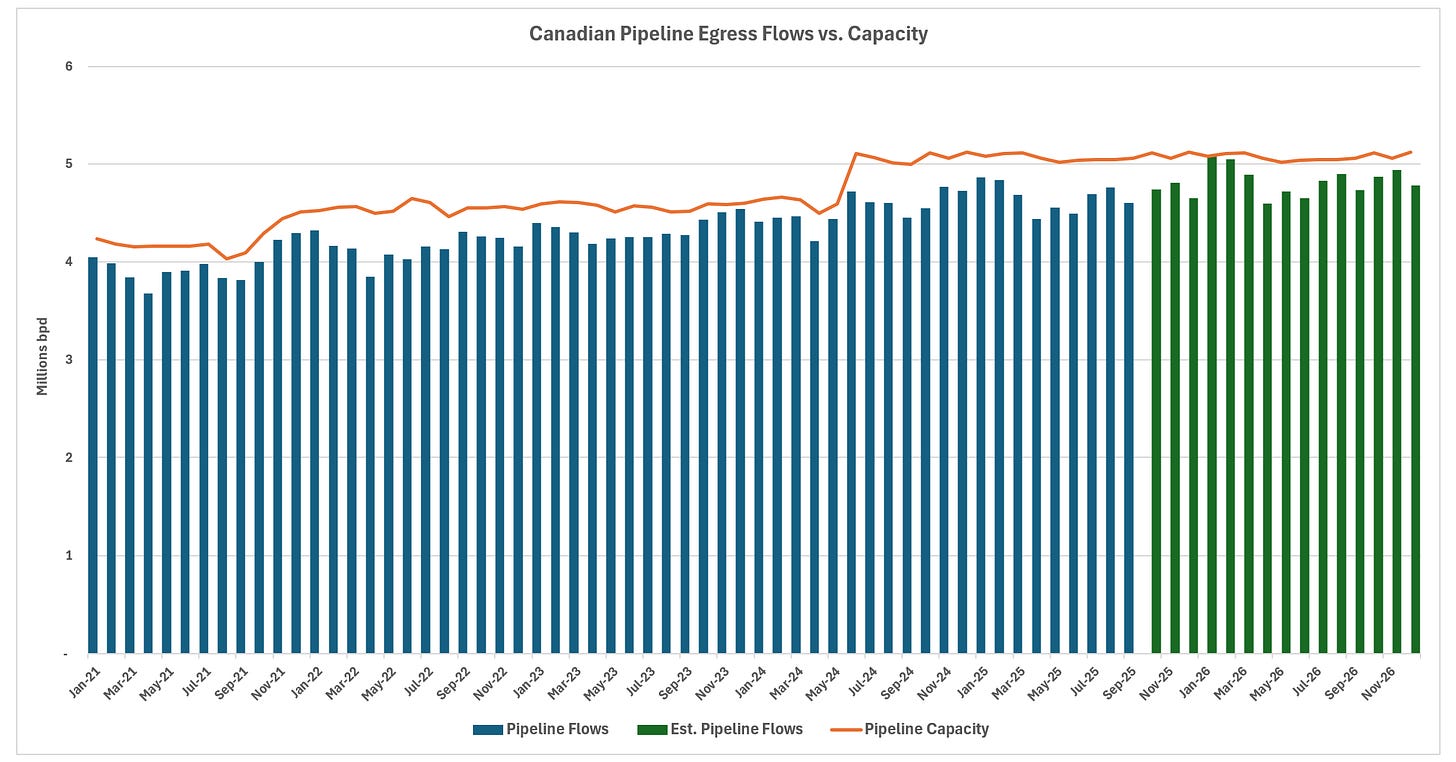 Modest Canadian output growth faces seasonal pipeline limits starting Q1 2026, while Cushing maintains reliable eastbound light crude deliveries to key Midwest refining centers.