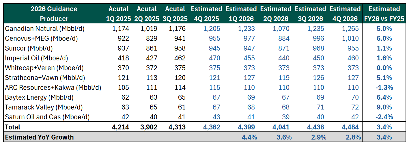 Canadian oil and gas producers have largely released their 2026 production guidance, pointing to continued modest growth in output. Modeling based on this guidance projects Canadian oil production to increase by around 3.5% in 2026 (see table below). Companies do not provide quarterly production cadence, but historically output peaks in the winter months of Q1 and Q4 due to seasonal patterns, which our quarterly forecast reflects.