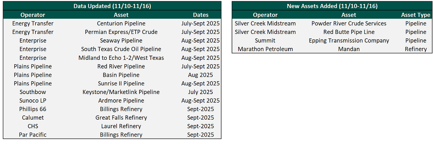 Plainview has over 250 assets with crude oil flow or transactional data on our platform and continues to add more each week. Data for existing assets under coverage are posted as soon as they become available. Below are the assets that were updated this week or newly added to coverage.