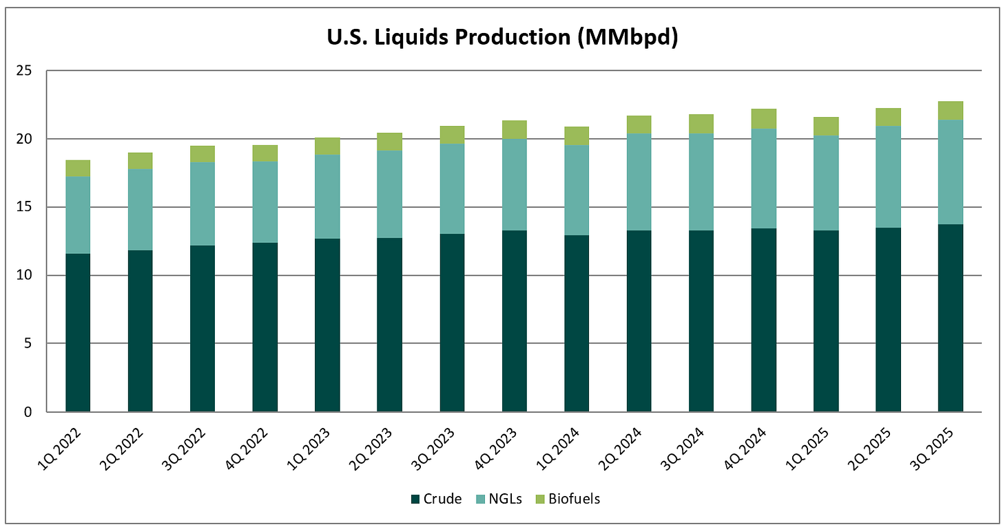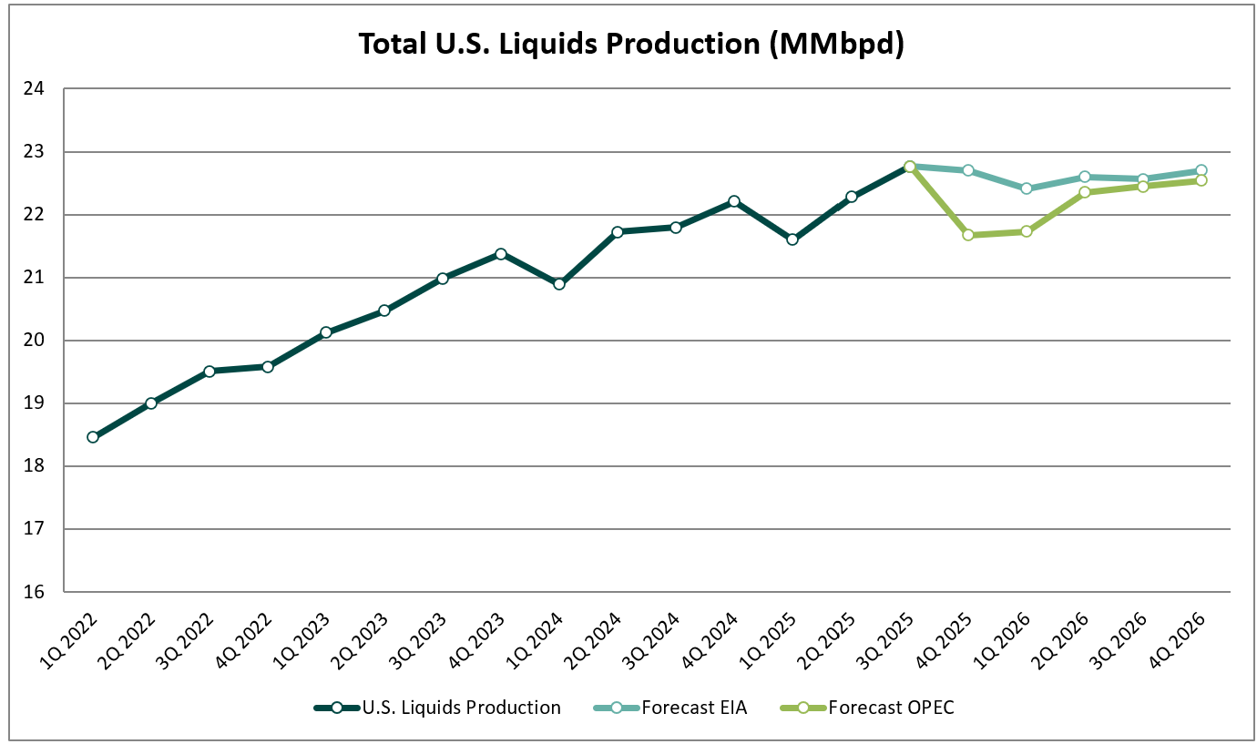Since the COVID-19 pandemic, U.S. liquids production, which encompasses crude oil, natural gas liquids, and biofuels, has demonstrated robust growth, expanding at annual rates of 4-8%. However, this momentum has moderated in recent years, with 2024 and 2025 seeing more tempered increases at the lower end of that range. With recent liquids pricing pressure, a notable divergence has emerged in forward-looking estimates: OPEC’s latest Monthly Oil Market Report projects a nearly 5% decline in US liquids output from Q3 2025 to Q4 2025. This starkly contrasts with the US Energy Information Administration’s (EIA) Short-Term Energy Outlook, which anticipates relatively flat production during the same period, highlighting a growing rift in global energy forecasting amid volatile market dynamics.