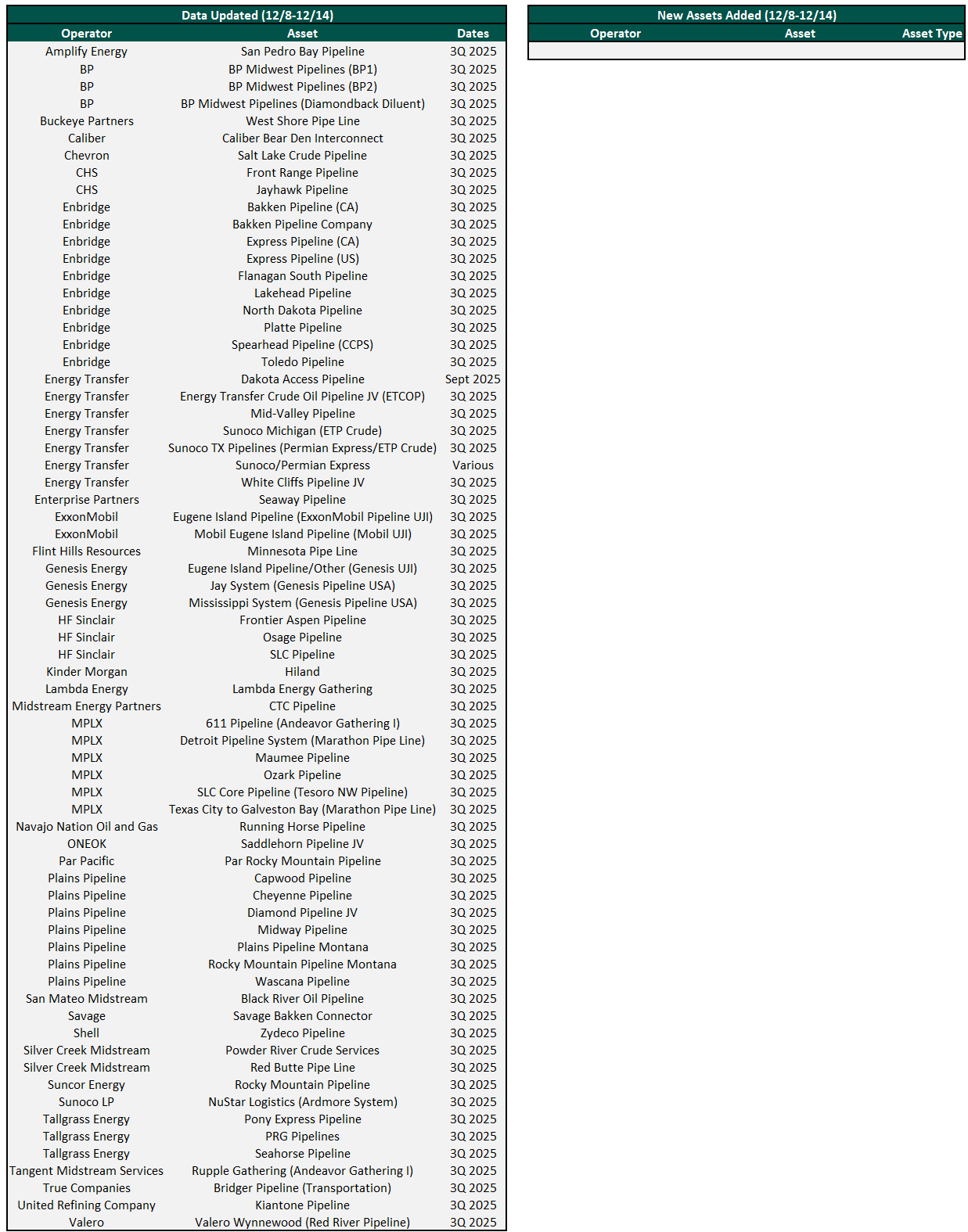 Plainview has over 300 assets with crude oil flow or transactional data on our platform and continues to add more each week. Data for existing assets under coverage are posted as soon as they become available. Below are the assets that were updated this week or newly added to coverage.
