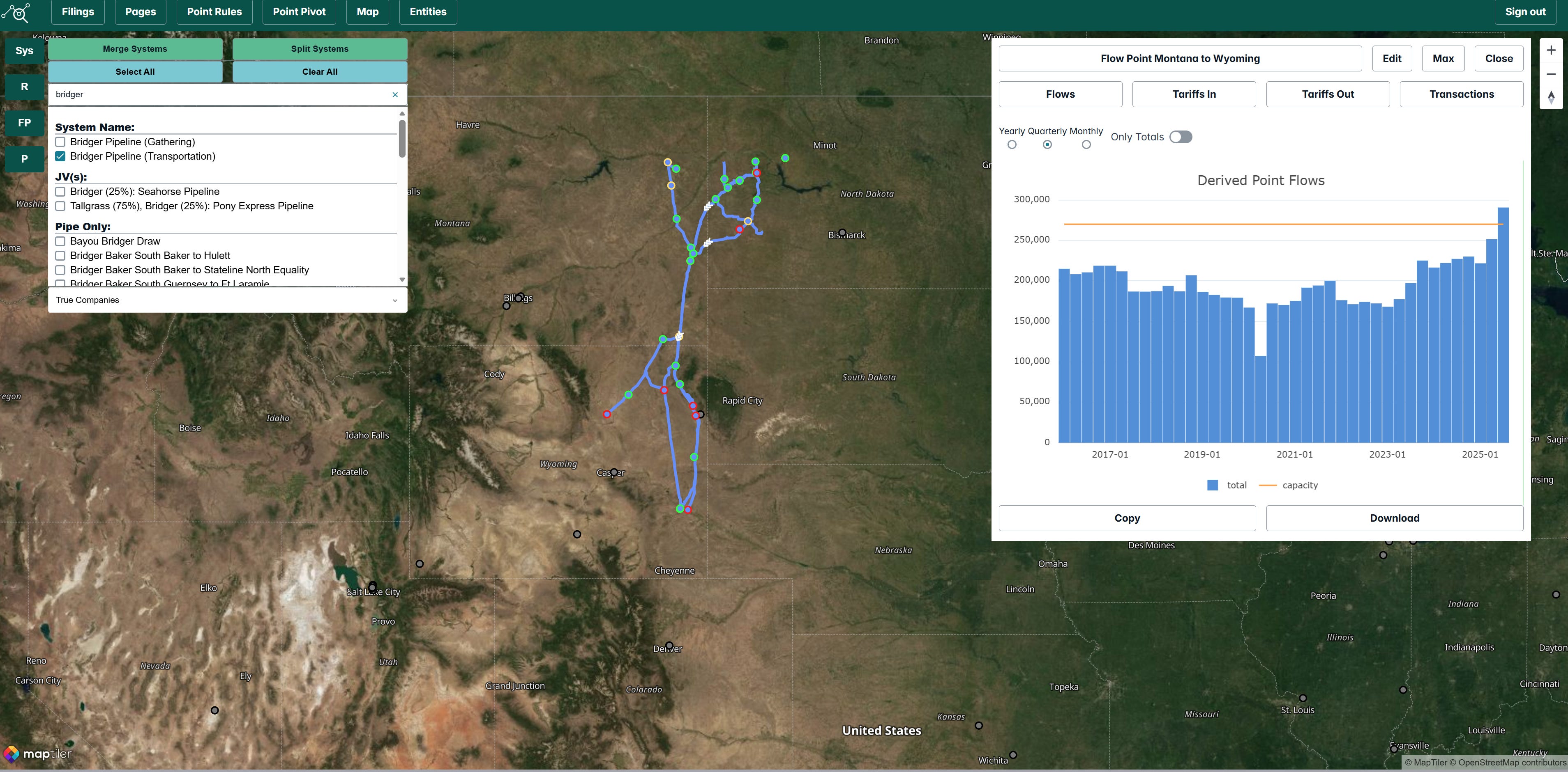 New Q3 2025 data reveals the first clear impact of Kinder Morgan’s Double H pipeline conversion from crude to NGL service. Previously transporting 60,000–70,000 barrels per day of Bakken crude to Guernsey, Wyoming, Double H volumes fell by approximately 50,000 bpd from Q2, leaving only about 10,000 bpd in Q3. Most of these displaced barrels shifted to the Bridger pipeline, which added roughly 40,000 bpd quarter-over-quarter and pushed flows above our estimated nameplate capacity of 270,000 bpd. Bridger’s gains are likely attributable to its competitive tariff rates and superior netbacks relative to other egress options.