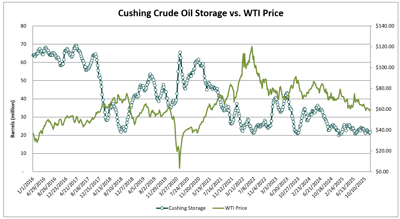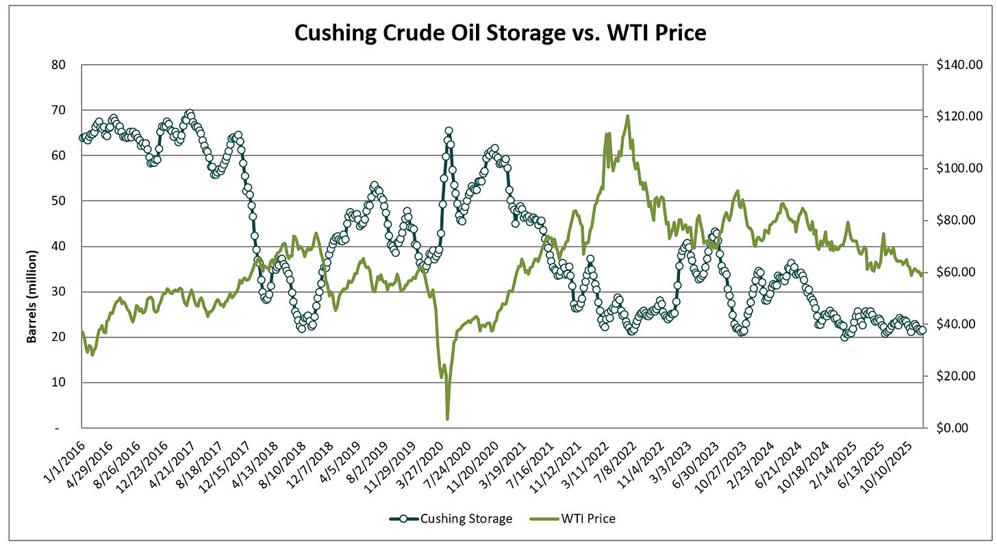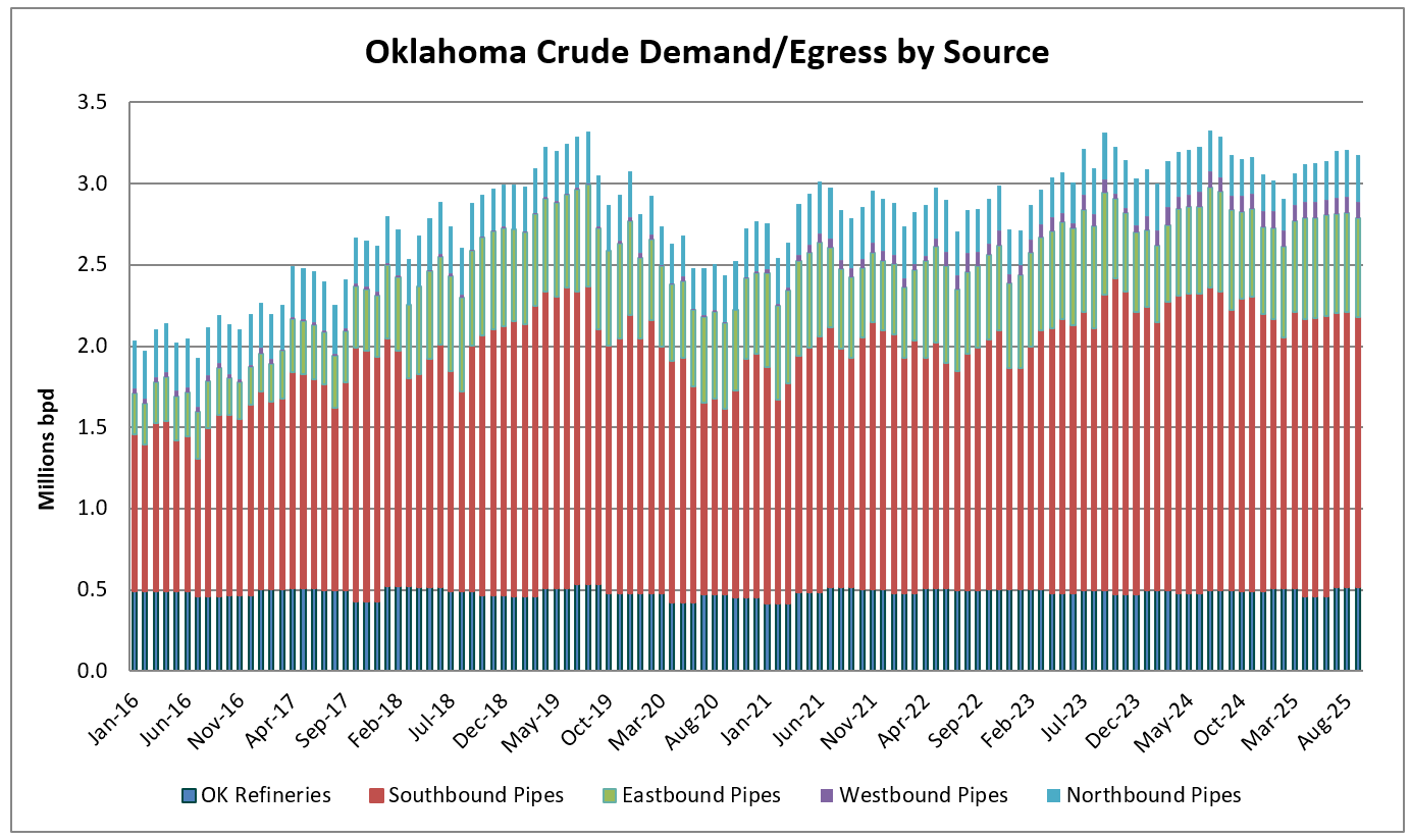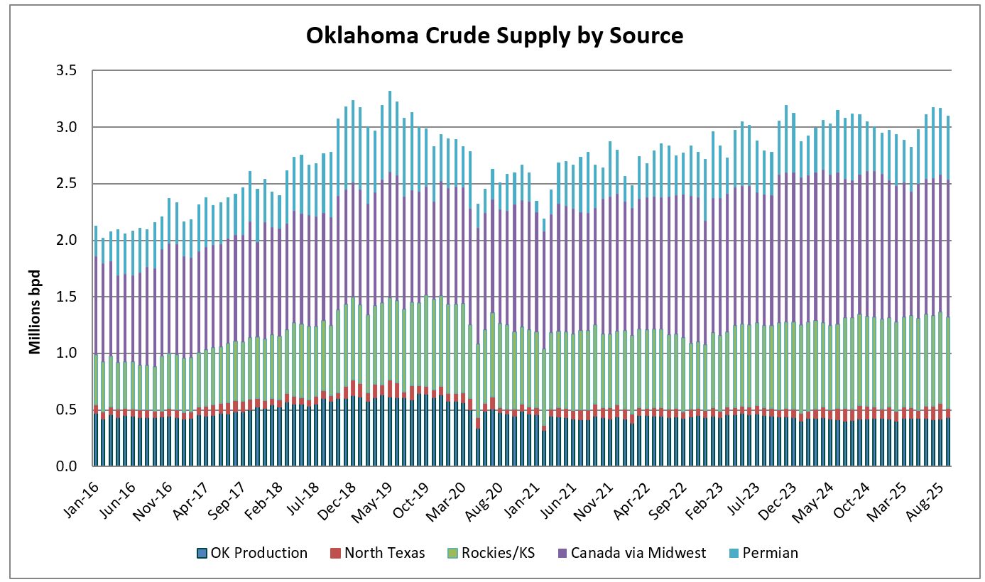 Even in the face of record low storage levels, supply inflows into Oklahoma, nearly all destined for Cushing, remain near the record highs set in mid-2019. Although Oklahoma crude production has declined by about 200,000 barrels per day since then, and significant Permian volumes have rerouted directly to the Gulf Coast via new pipelines, increased deliveries from the Rockies and Midwest, including heavy Canadian crude, have offset these losses. This robust inbound supply has kept Cushing well supplied and liquid despite the inventory drawdown.