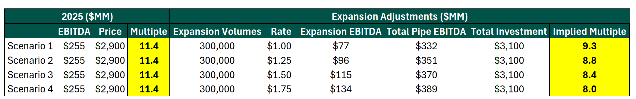 Plains anticipates achieving a 10x EBITDA multiple on the acquisition by 2026, with further improvements tied to operational enhancements and expansions. Based on financial disclosures from Kinetic and S&P Global ratings, we estimate the pipeline’s estimated 2025 EBITDA at approximately $255 million, implying an initial 11.4x multiple on the full purchase price.