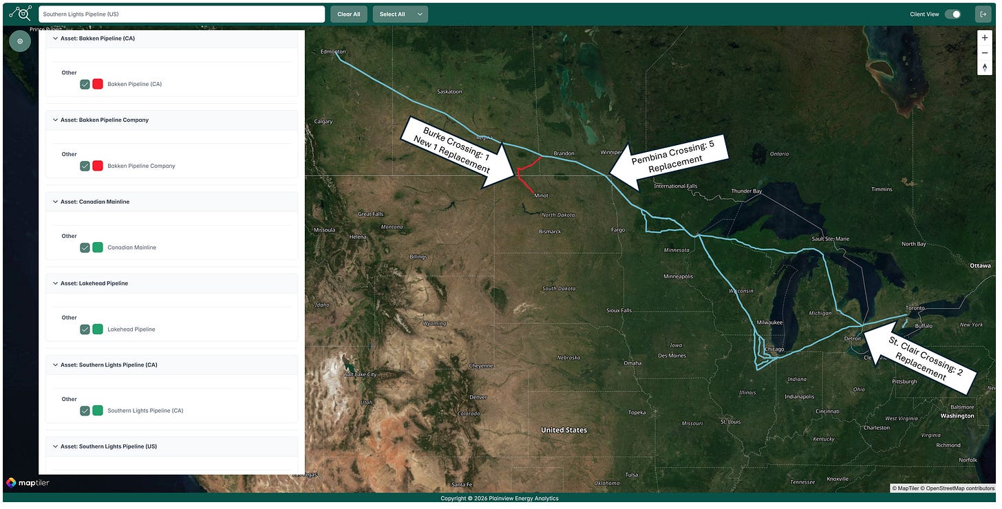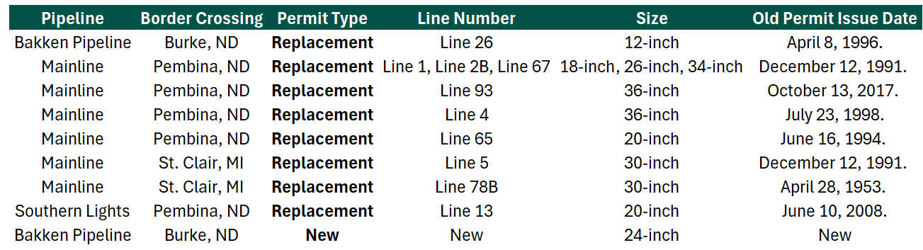 The Trump administration yesterday issued nine presidential permits authorizing oil and liquid material crossings along the U.S.-Canada border for Enbridge’s lines. Eight of these permits appear to serve as replacements or “refreshes” of existing authorizations. These updates are likely intended to strengthen legal language and modernize the regulatory standing of critical conduits. The refreshed permits cover Enbridge Mainline’s six existing lines in Pembina County, North Dakota, the primary gateway to the U.S. Additionally, the permits cover two of Enbridge’s Mainline export lines from St. Clair, Michigan back into Canada. The Southern Lights and Bakken lines also received refreshed permits covering their existing infrastructure.