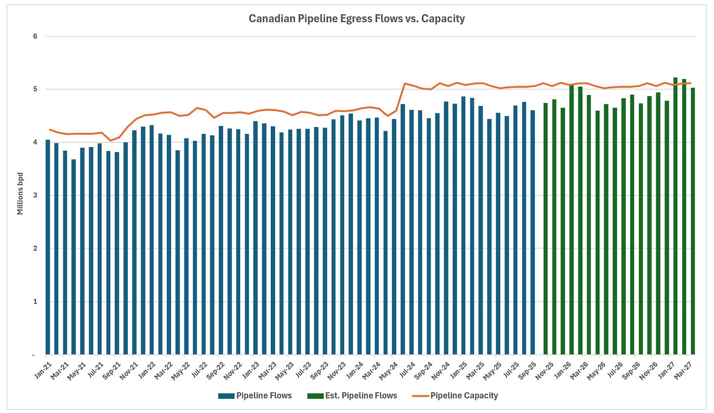 As we previously covered, Canadian producers have guided to around 3.0% percent exit-to-exit production growth from 2025 to 2026, translating to more than 100,000 additional barrels per day of supply. This incremental output is poised to fill much of the expanded capacity. Our modeling indicates that, absent this DRA project or other expansions, Canadian egress pipelines could exceed limits by early 2027, driven by sustained production increases and seasonal spikes from higher winter condensate blending requirements (graph below).