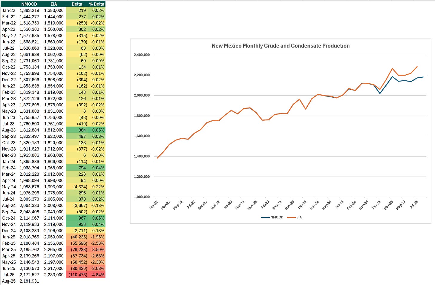 New Mexico’s C-115 submissions exhibit comparable delays, with 2025 variances of 2–5% below EIA reporting. The delta between EIA and New Mexico state reported production exceeds both 2023 and 2024 observed differences but aligns closely with 2022, indicating the delta is not unprecedented.