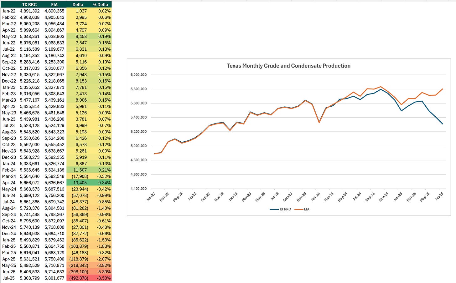 Texas mandates monthly production reports from all producers by the end of the subsequent month, but the regulator notes that there are revisions spanning 6 to 8 months due to delayed reporting, resulting in lower reported production versus actual. For April through July 2025, Texas reported production currently lags EIA estimates by 2 to 8%, levels in line with historical reporting.