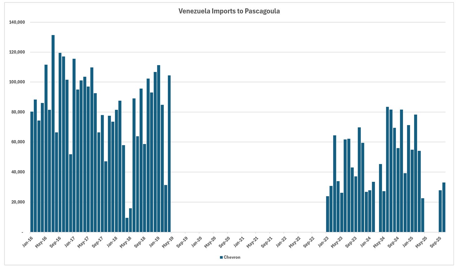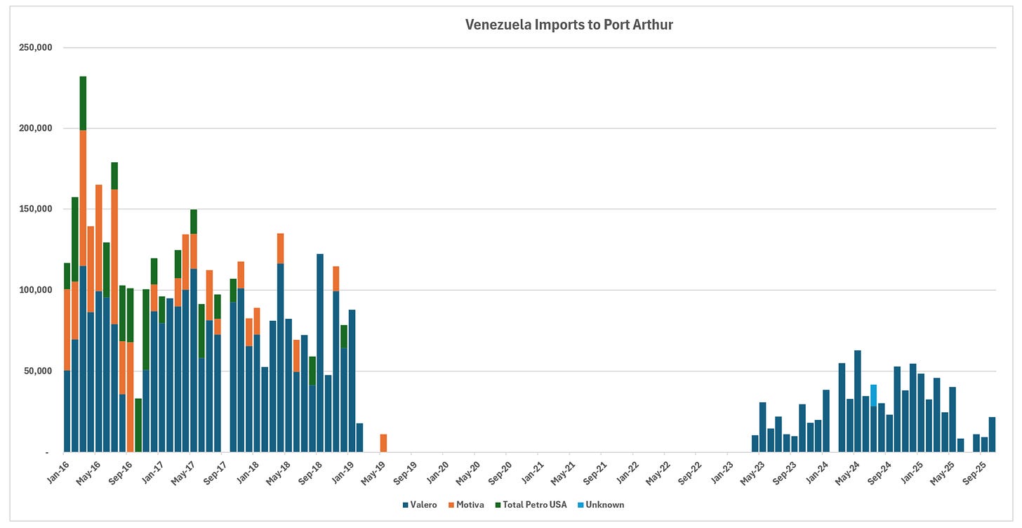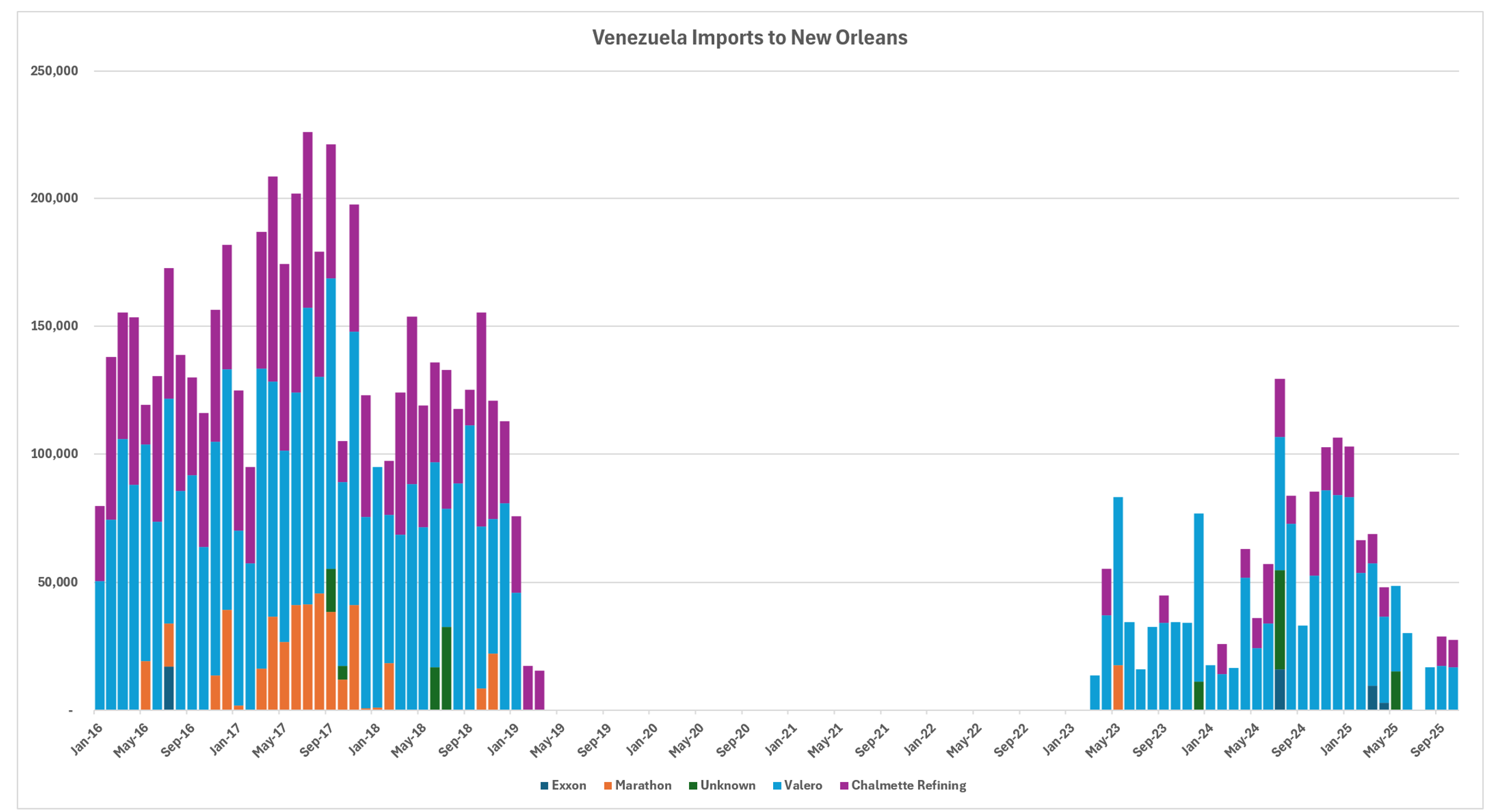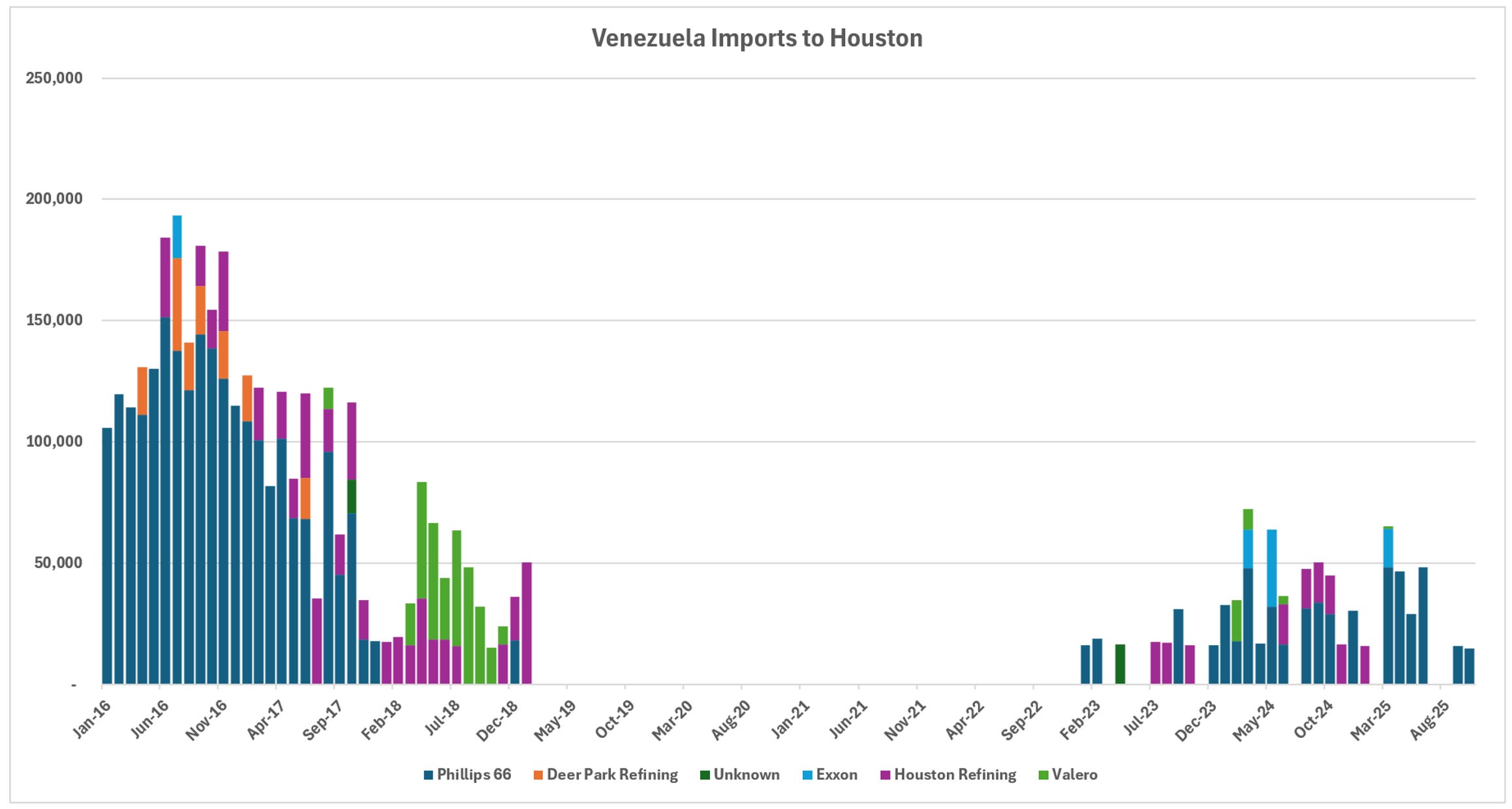 Importer profiles have evolved significantly. Prior to the embargo, CITGO and Valero dominated receipts, with substantial contributions from Chevron, Phillips 66, and others. In the post-embargo recovery phase, Valero emerged as the leading importer, drawing volumes across multiple Gulf Coast locations including Corpus Christi, Port Arthur, and New Orleans areas. Chevron has focused primarily on its Pascagoula refinery, leveraging its upstream presence in Venezuela. CITGO refineries no longer appear to process Venezuelan crude in recent data, while smaller volumes reach entities like PBF on the East Coast.