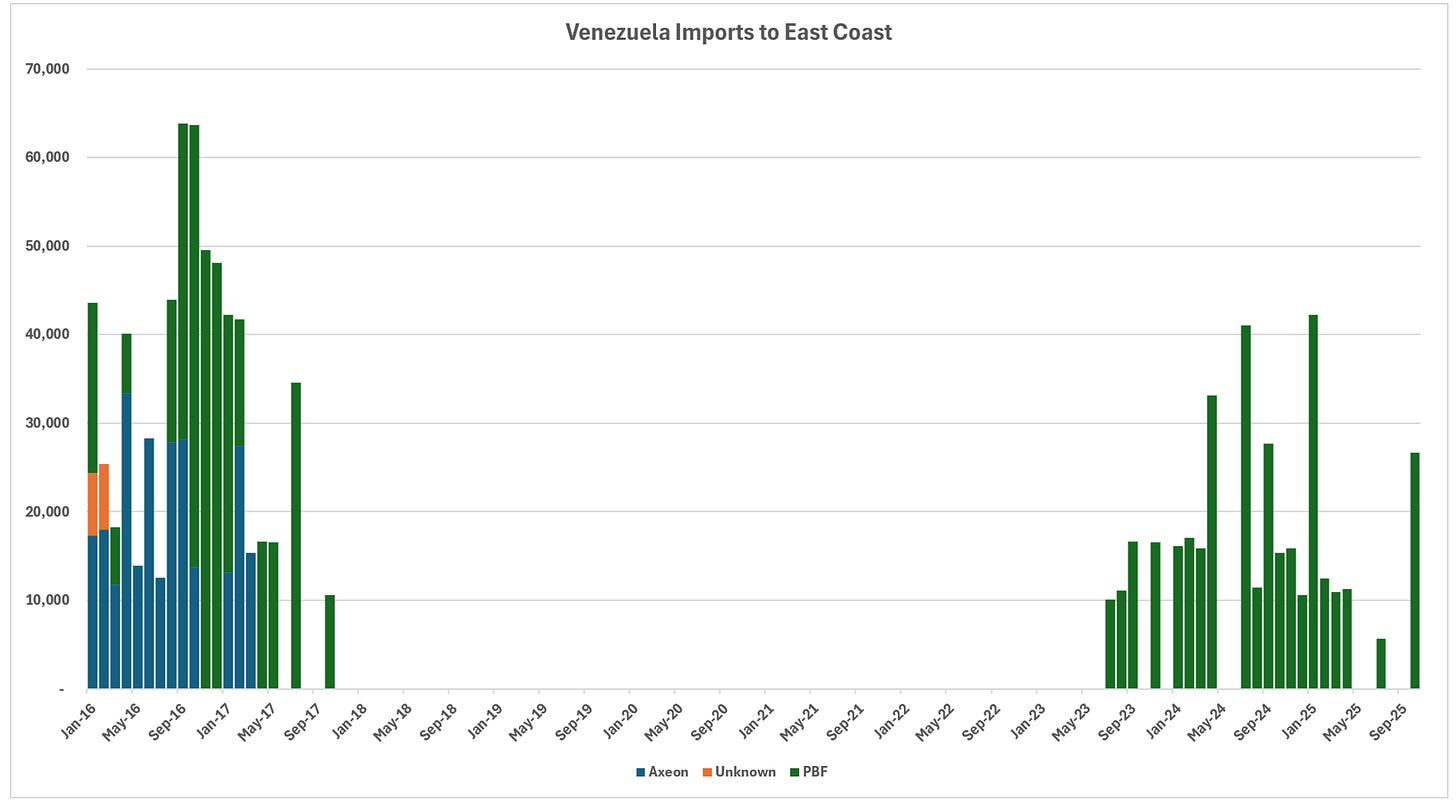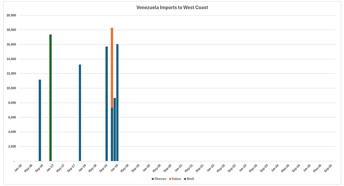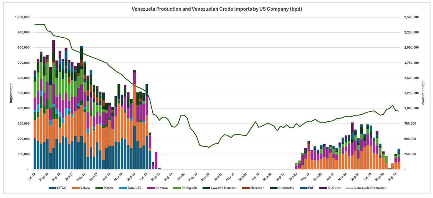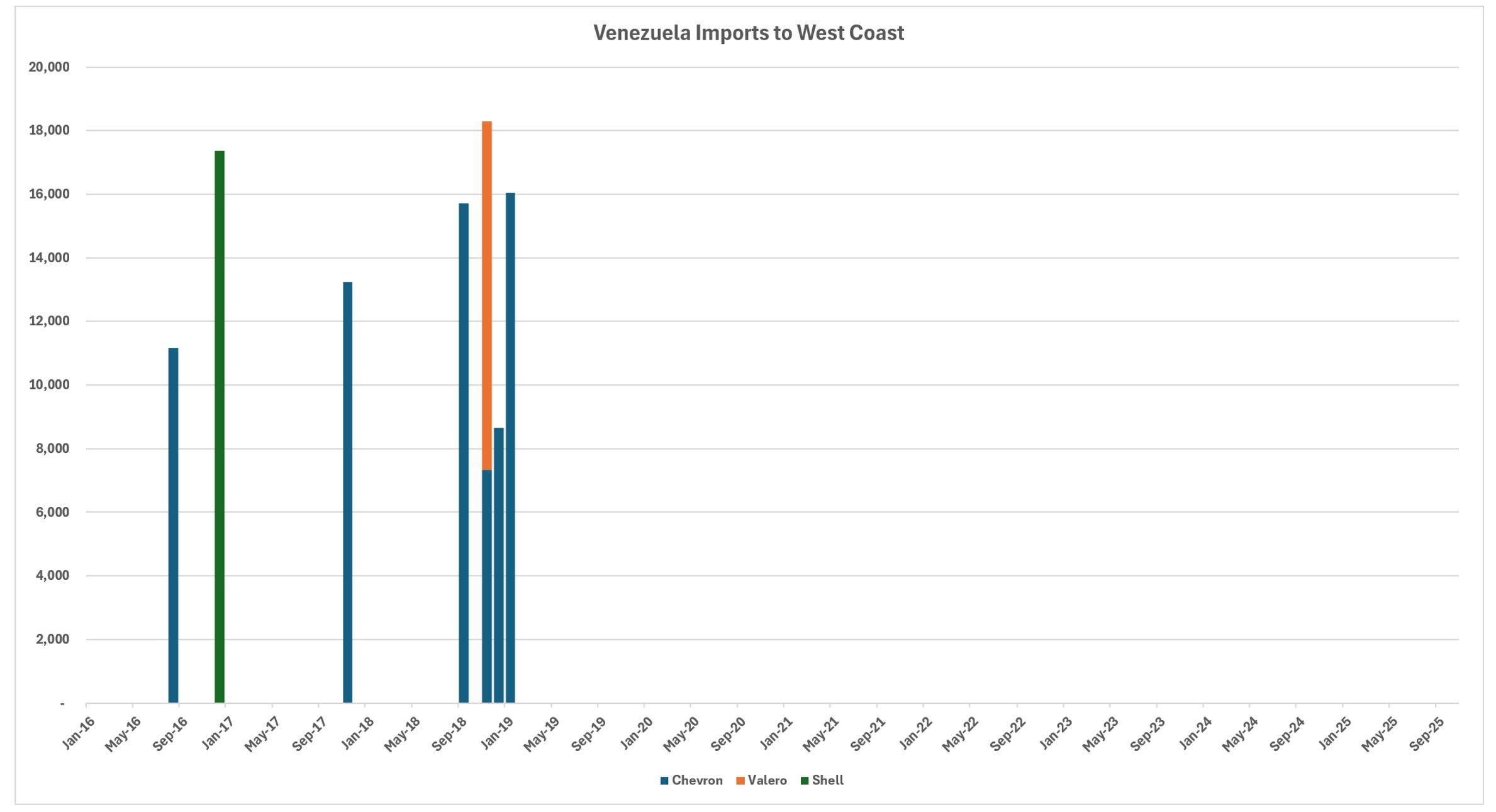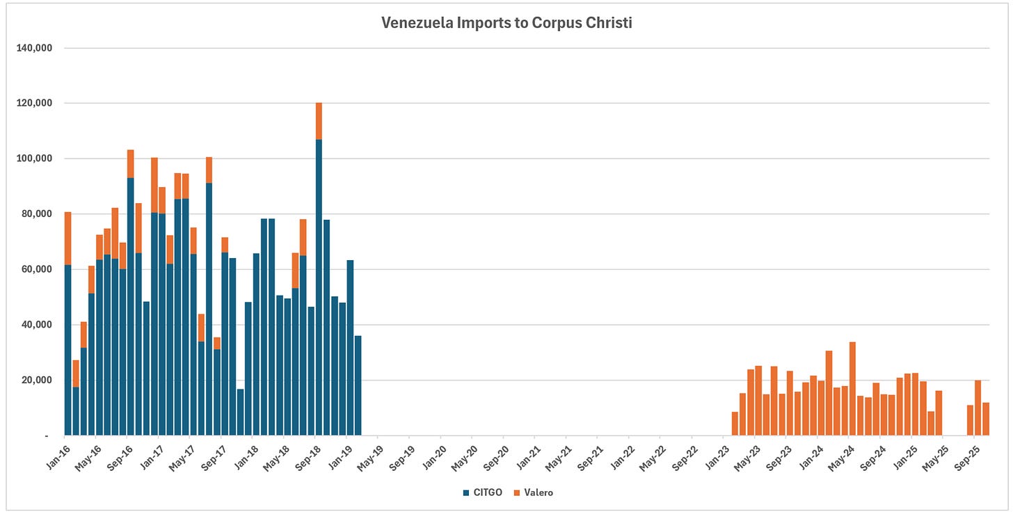 Importer profiles have evolved significantly. Prior to the embargo, CITGO and Valero dominated receipts, with substantial contributions from Chevron, Phillips 66, and others. In the post-embargo recovery phase, Valero emerged as the leading importer, drawing volumes across multiple Gulf Coast locations including Corpus Christi, Port Arthur, and New Orleans areas. Chevron has focused primarily on its Pascagoula refinery, leveraging its upstream presence in Venezuela. CITGO refineries no longer appear to process Venezuelan crude in recent data, while smaller volumes reach entities like PBF on the East Coast.