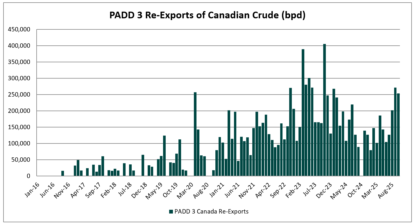 Market participants remain watchful about the potential arrival of additional Venezuelan heavy crude on global markets, particularly its implications for Canadian heavy oil producers whose volumes flow to US Gulf Coast refineries in PADD 3. The majority of Canadian heavy crude reaches the region via Seaway and Keystone/Marketlink pipelines, which offer direct access to both domestic refineries and major export terminals in locations like Freeport, Texas City, Houston Ship Channel, and Nederland (see photo above). US trade data shows average re-exports of Canadian crude from the Gulf Coast at around 175,000 barrels per day over the past four years (see figure below), highlighting built-in optionality for these volumes to reach international markets. While increased Venezuelan supply may exert some downward pressure on heavy crude pricing worldwide, the robust export capabilities for Canadian barrels should help mitigate any severe negative impacts.