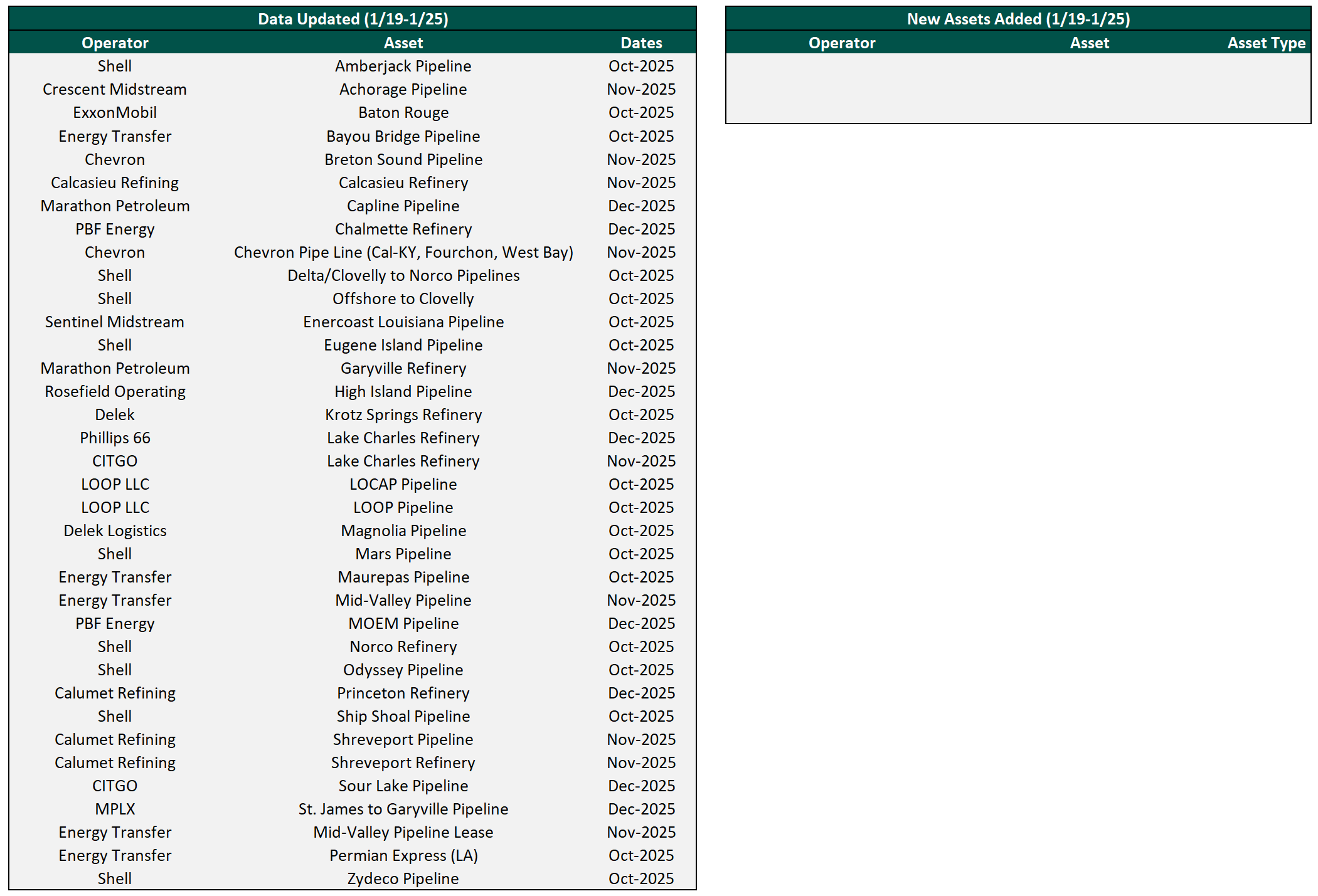 Plainview has over 300 assets with crude oil flow or transactional data on our platform and continues to add more each week. Data for existing assets under coverage are posted as soon as they become available. Below are the assets that were updated this week or newly added to coverage.